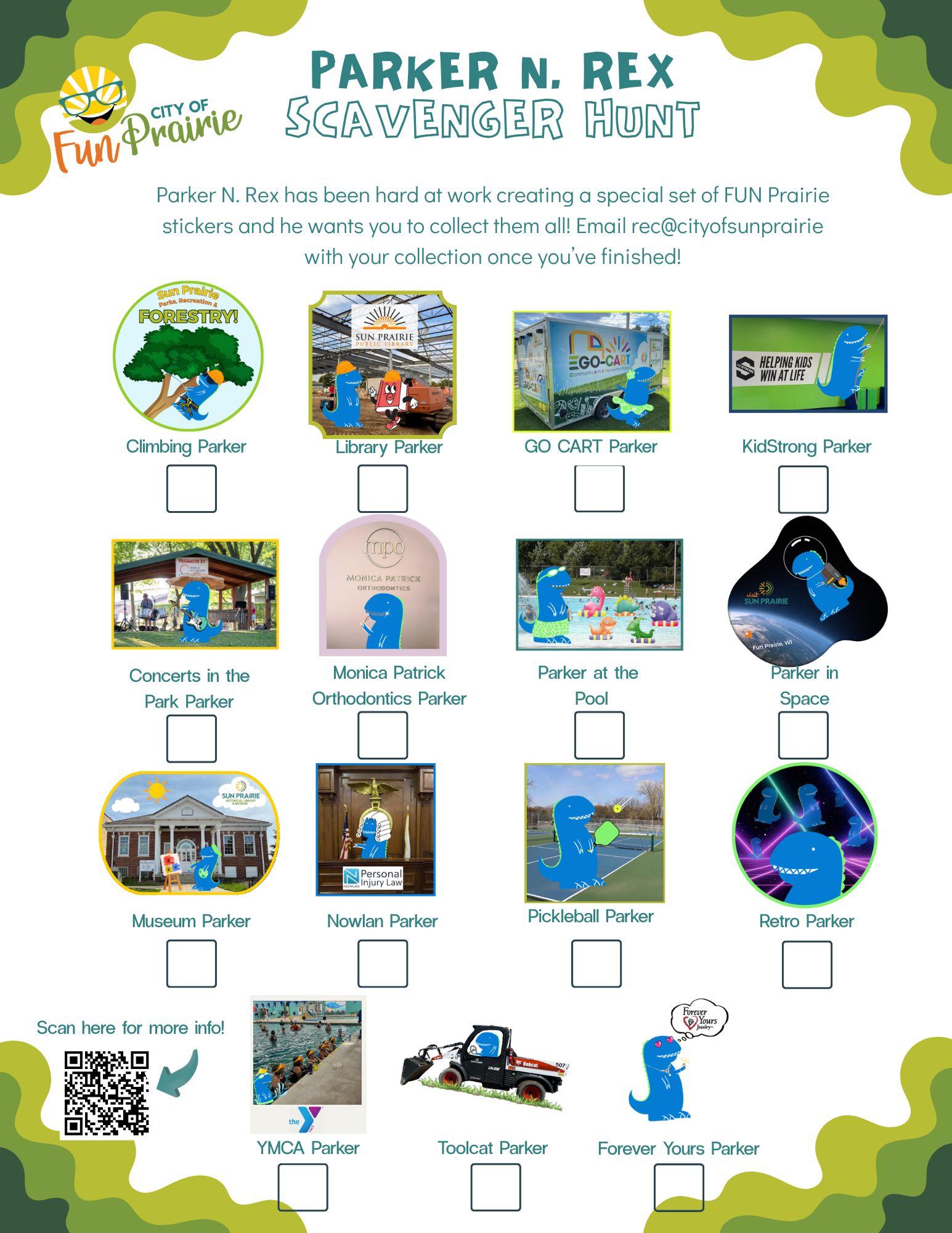 FUN Prairie HighlightsDon't miss these exciting activities and events! GO-CART (Community Arts & Recreation Trailer) The GO-CART project is a community arts and recreation trailer offering FREE enriching activities for all ages throughout Fun Prairie. Programs GO directly to kids in the neighborhoods where they live and play. The projects is co-created with the Sun Prairie Parks, Recreation & Forestry Department and Prairie Music & Arts. It includes experiences such as lawn games, sports, fitness activities, music-making, arts & crafts, dance, creative writing, and interactive guest performances by professionals in the arts community. Find the GO-CART schedule here. Parker N. Rex's Sticker Scavenger Hunt Collect all 14 stickers and be entered into a drawing to win great prizes including a one-year family membership to the Sun Prairie YMCA! Pedal the Prairie Whether you’re cruising the scenic roads of Sun Prairie or spinning indoors, challenge yourself to pedal 100 miles (or more!) between July 1 and August 31. That’s just an average of 12 miles per week! Track your miles, set your own pace, and enjoy the ride. Food Truck Night Join us for a lineup of 10+ local food trucks serving up everything from mouthwatering tacos to gourmet burgers, sweet treats, and more! Skip the cooking and make these Monday nights something to look forward to! Parker N. Rex's Dino Egg Hunt Grab your binoculars and get ready for an egg hunt that send you back into prehistoric times. Join us for a Pop-Up Dino Egg Hunt where you can search for prizes hidden in dinosaur eggs. Egg Hunt location will announced 10 AM on July 3th on our Facebook Page! Take N' Make Monday Stop by the Westside Community Services Building for a to-go craft kit to do with your gamily! It's first come, first serve, so be sure to get there quick! | FUN Prairie Highlights Cont.Don't miss these exciting activities and events! Concerts in the Park Join us for a free live concert in the park! Food and beverage sales begin at 5:00 pm and music begins at 6:00 pm. July 7: Sons of Sconnie (rock, pop & country) Madtown Pickleball Open Come check out Wisconsin's largest outdoor pickleball tournament featuring over 400 pickleballers! Whether you're a seasoned pro or a beginner, this doubles tournament promises an action-packed, competitive experience for adult players ages 18+. Don't play? No worries! Come spectate this exciting event - free and open to the public! Pop-Up Beer Garden Jump in the time machine and party like its 1990! Play some 90s themed games, and get those pipes ready for 90's themed karaoke! Splash N' Sizzle Pool Party Get ready for the ultimate family-friendly summer celebration with music, food, and poolside fun! Whether you're making a splash in the water, grooving to the DJ's beats, or enjoying delicious food, this event is all about good times, great vibes, and family fun. SPU Community Day at the FAC! Dive into fun with a pool day sponsored by Sun Prairie Utilities! The first 150 guests get FREE admission - don't miss out on a splashing good time! Slide-a-Mile Challenge Think you have what it takes to slide your way to a mile? Join us for the annual Slide-A-Mile Challenge, where 26 thrilling trips down the big slide add up to one mile of pure splash-tastic fun! Adult Swim (ages 18+ only) Attention all adults, ages 18 and above! Have you ever wanted to slide down the gigantic slide at the Family Aquatic Center, but didn't want to be the only adult? Come enjoy a FREE night of fun in the water! Swim at your own pace, enjoy the facilities, including the slides, spray features, and diving boards. It's the perfect opportunity to unwind, socialize, and embrace your inner child in a laid-back, adult-only setting. |