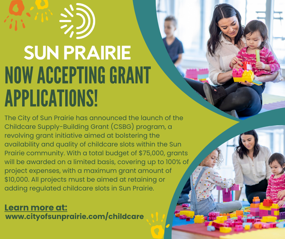 Administration: The City is excited to announce the launch of the Childcare Supply-Building Grant (CSBG) program, a revolving grant initiative aimed at bolstering the availability and quality of childcare slots within the Sun Prairie community.