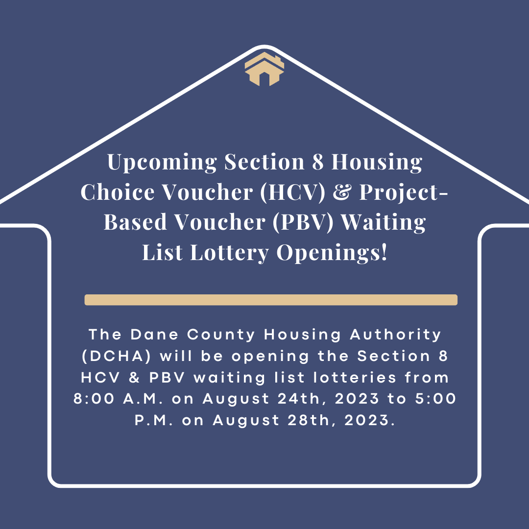 Community Spotlight: The Dane County Housing Authority (DCHA) will be temporarily opening the Section 8 Housing Choice Voucher (HCV) & Project Based Voucher (PBV) waiting list lotteries from 8:00 A.M. on August 24th, 2023 to 5:00 P.M. on August 28th, 2023.